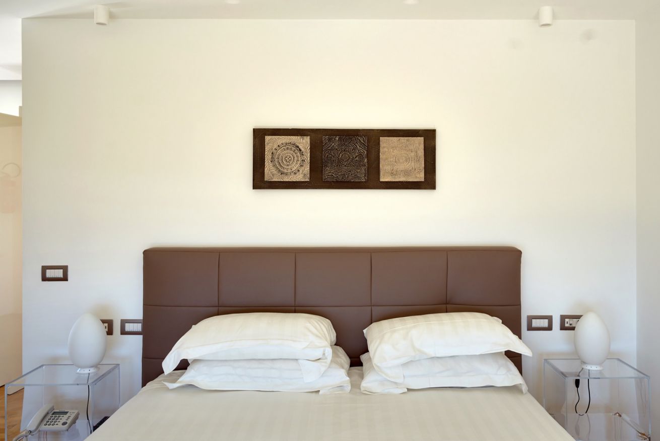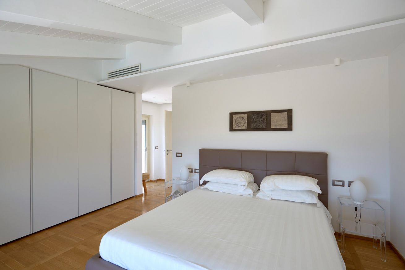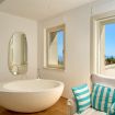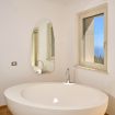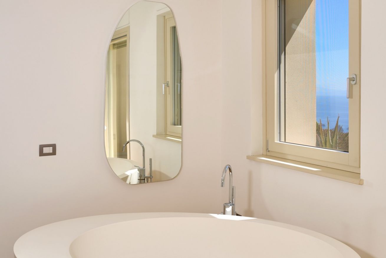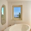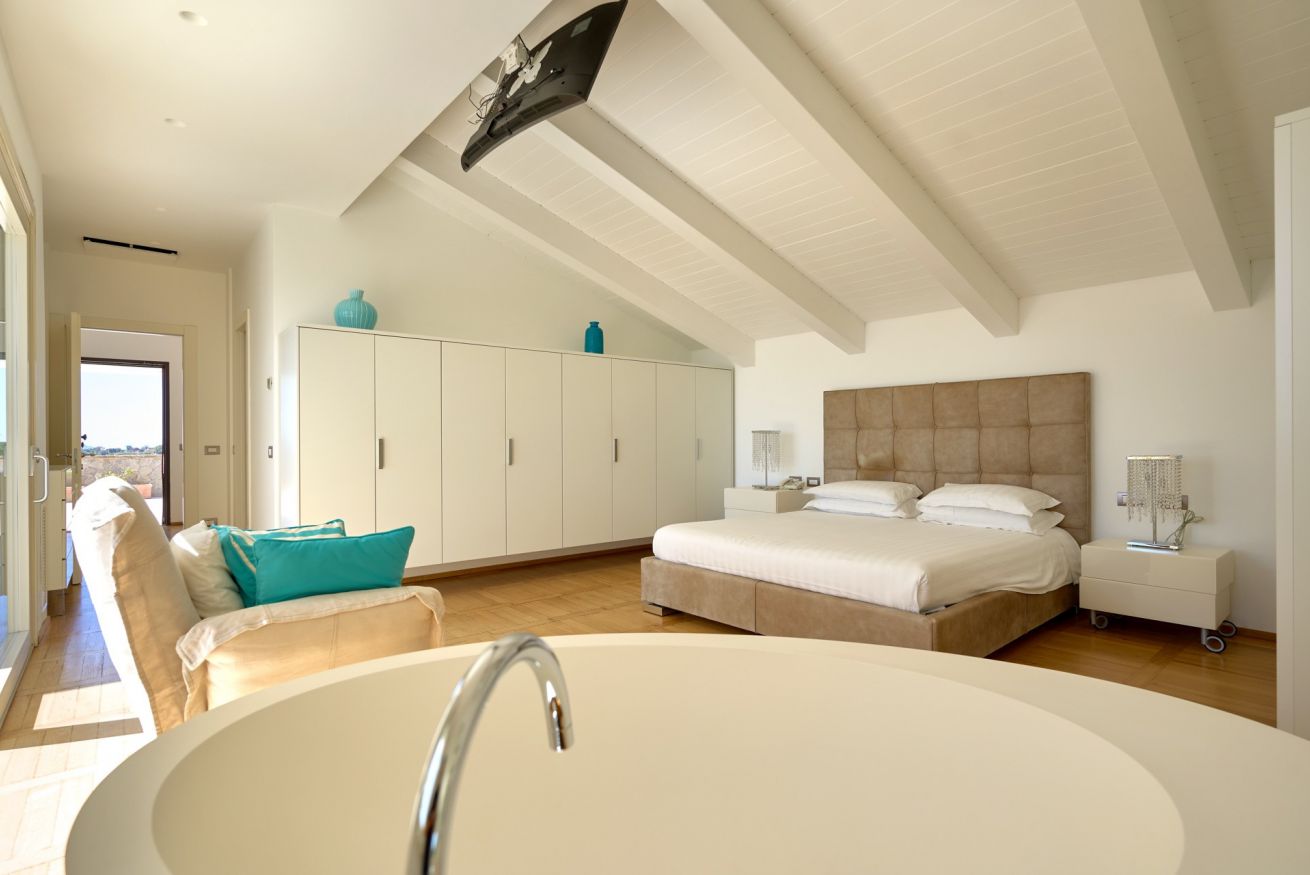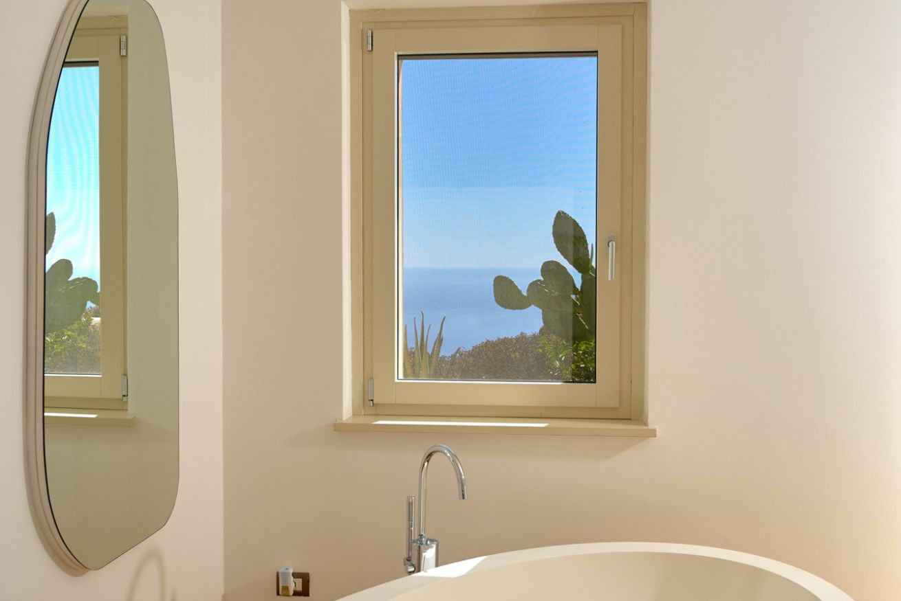 The master suites enjoy panoramic terraces and open bathrooms with sea views toward Li Galli.