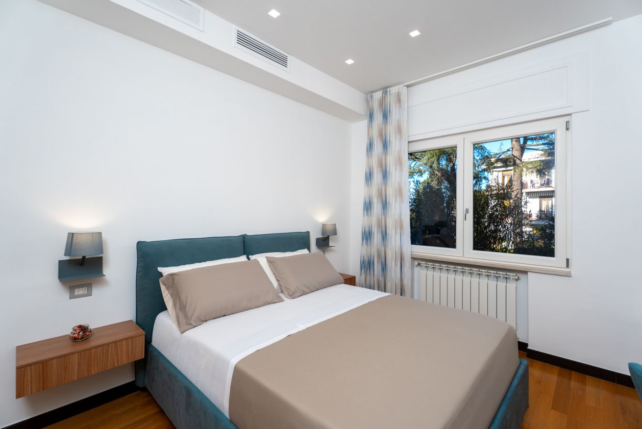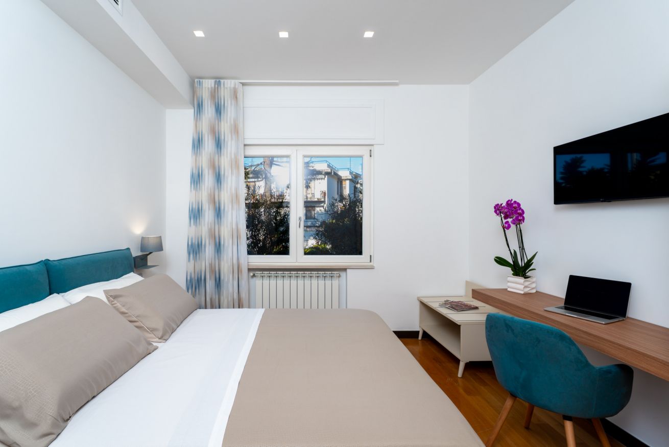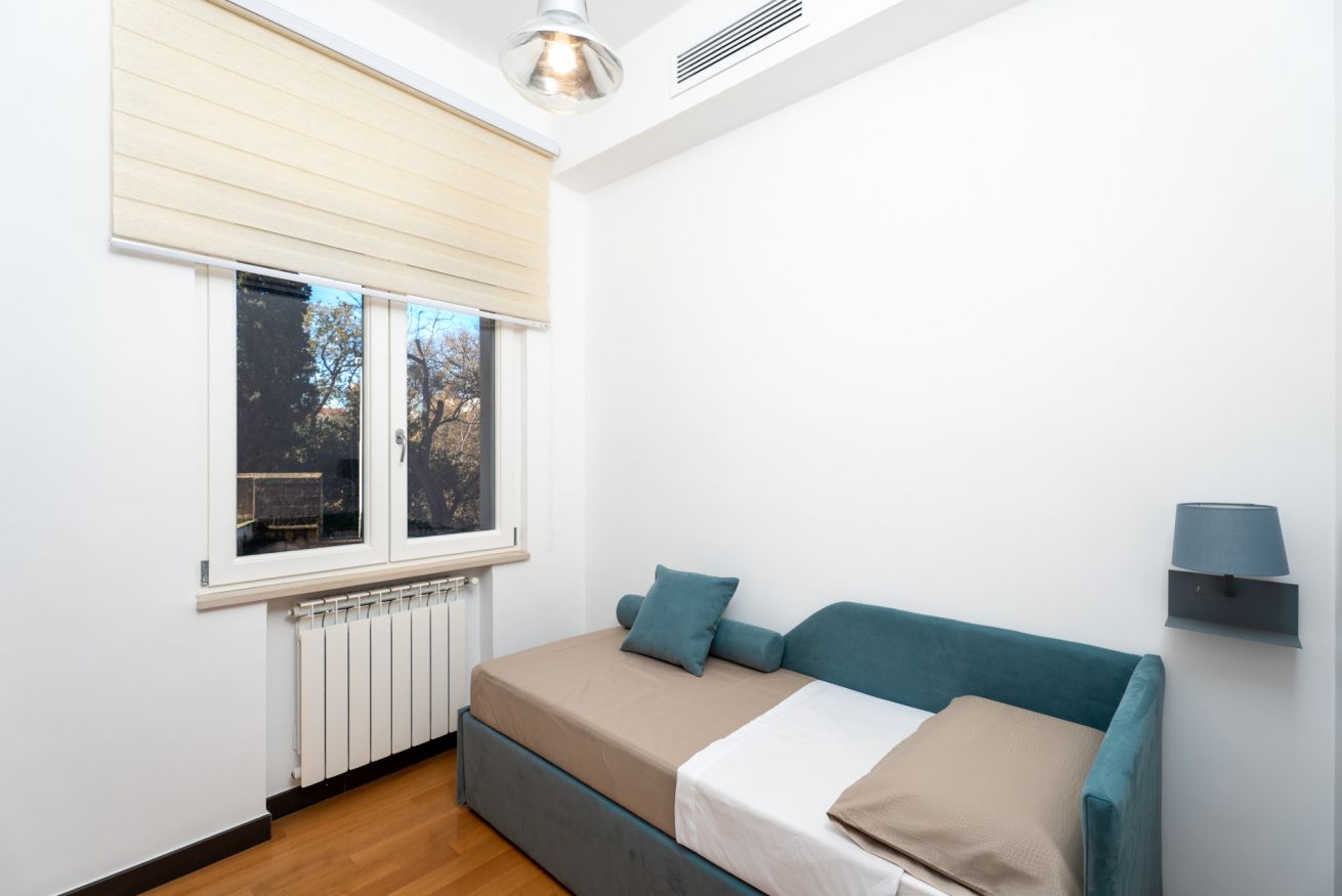 The apartment features two bedrooms: an elegant and relaxing master bedroom, and a single bedroom with a pull-out second bed, ideal for families, couples with children, or small groups of friends.