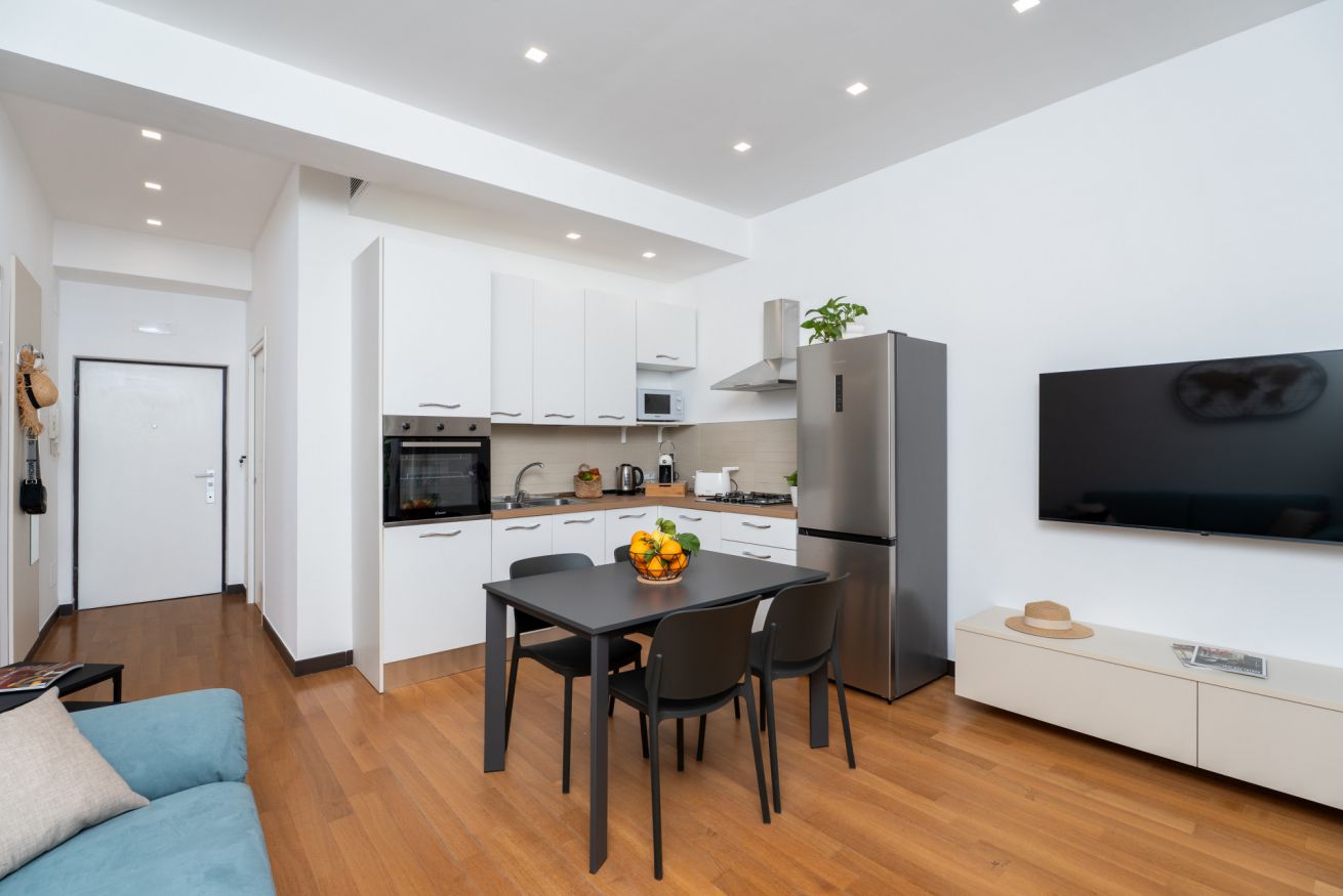 At the heart of the home is the spacious living area with a fully equipped kitchen, a modern and functional space where you can unwind after a day at the beach or enjoy a cozy dinner together. The bathroom offers a comfortable shower, while the furnished balcony invites you to enjoy breakfast outdoors or an aperitif at sunset.