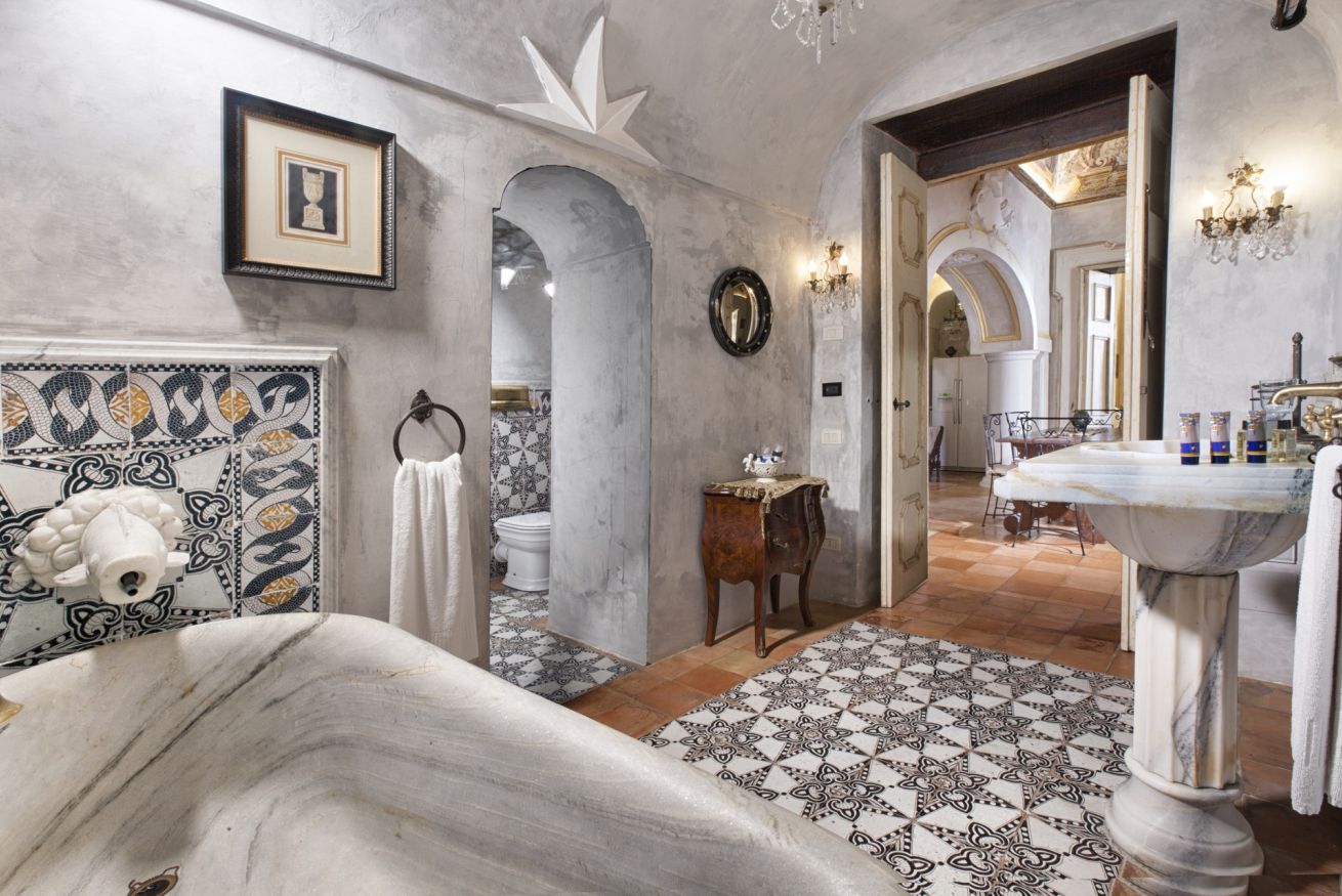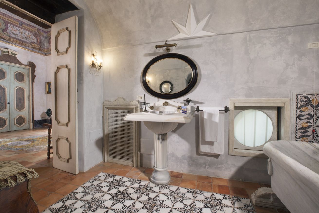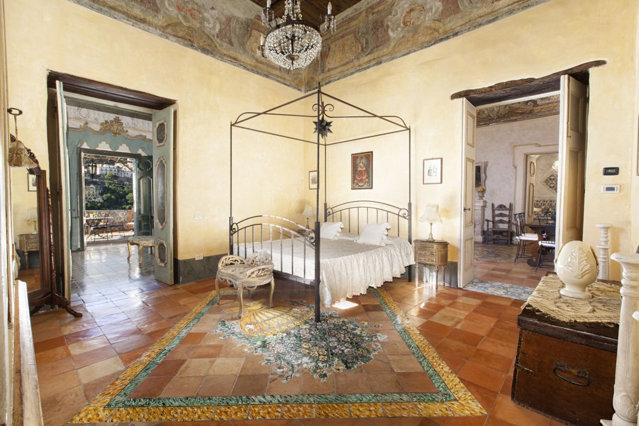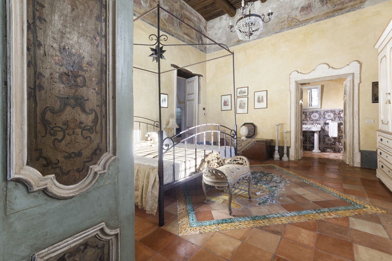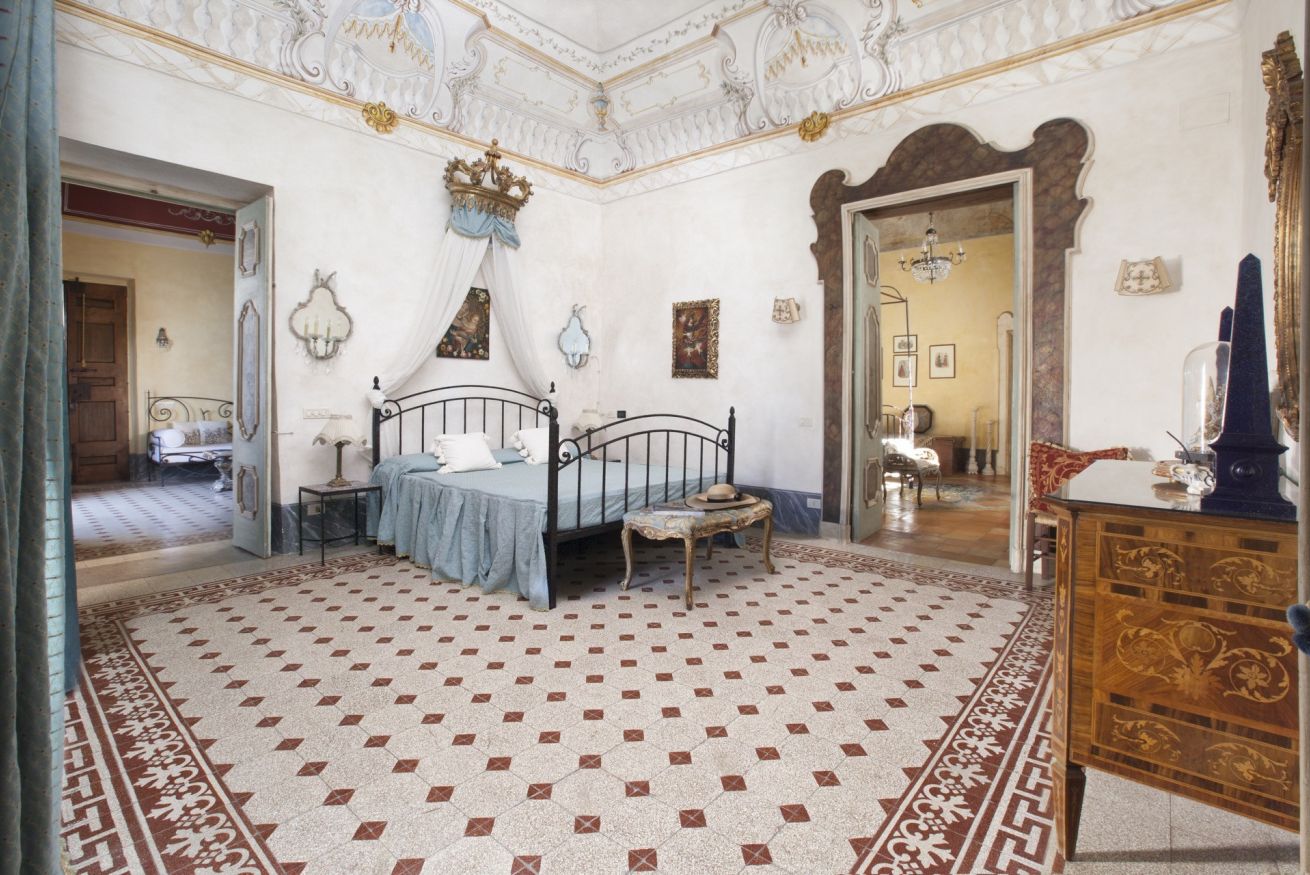 Immerse yourself in a unique, timeless atmosphere, enhanced by the original late Baroque frescoes found in the rooms, as well as by the countless artistic details that perfectly reflect the late-18th-century Mediterranean style of a typical noble residence. The home is located on the piano nobile of the eastern wing of the palace and is composed of four spacious rooms: the first two are used as a kitchen and living room, while the remaining two form the sleeping area, with two large bedrooms, one of which has an en-suite bathroom.