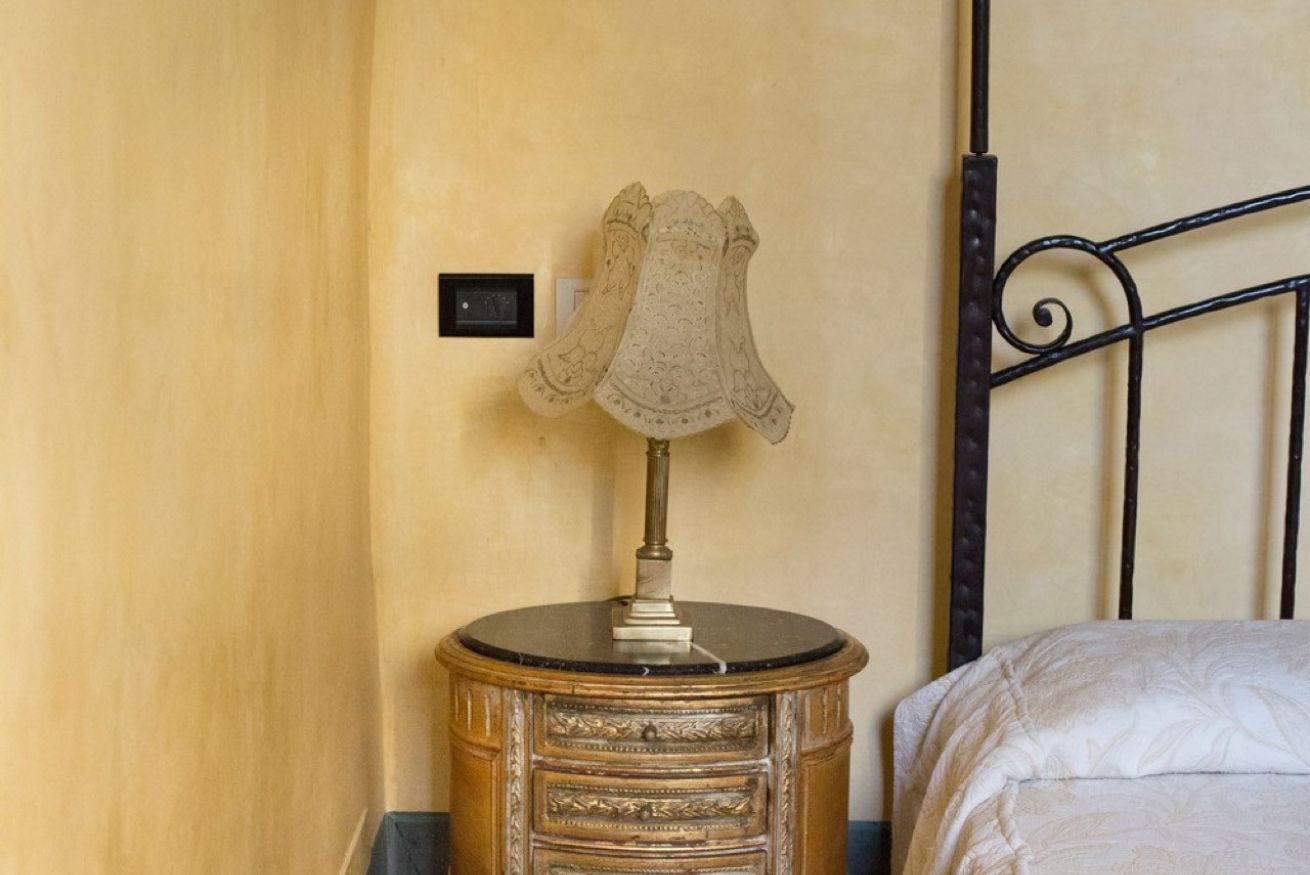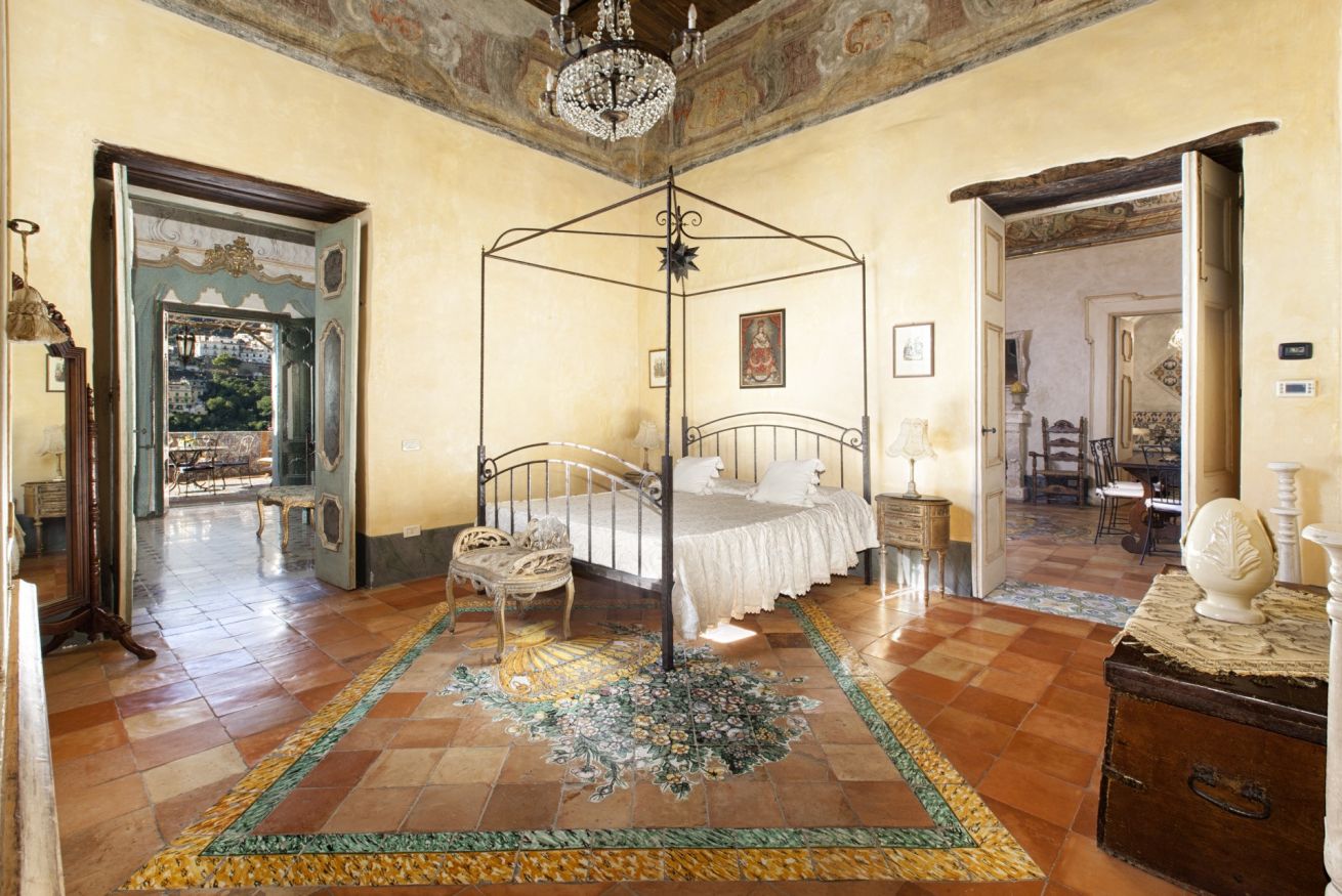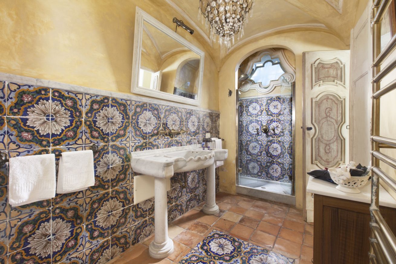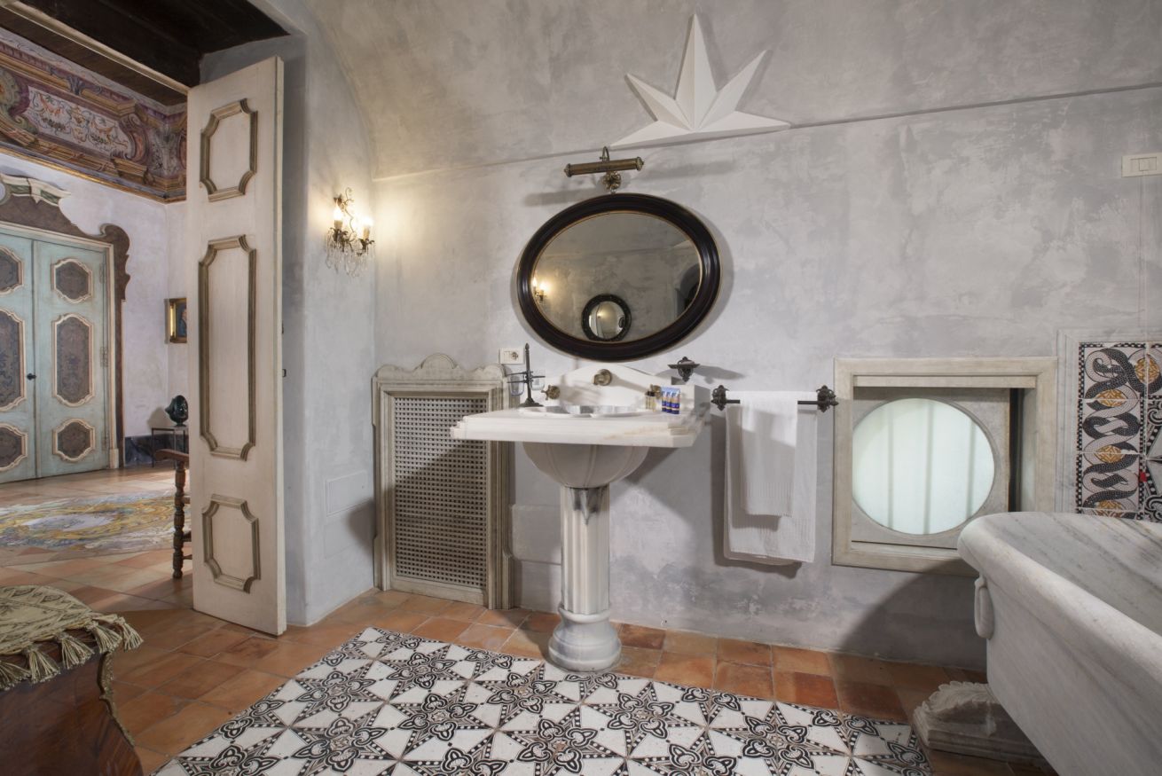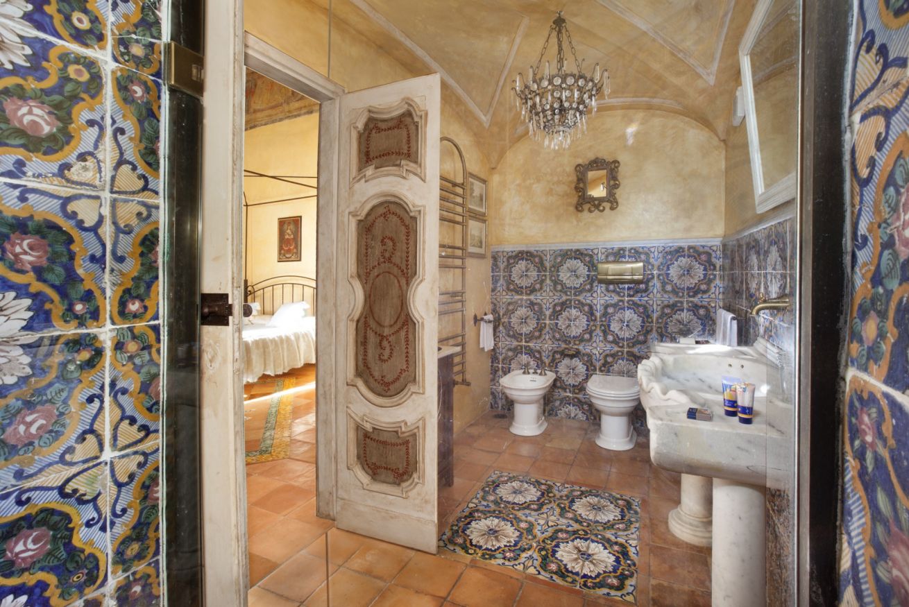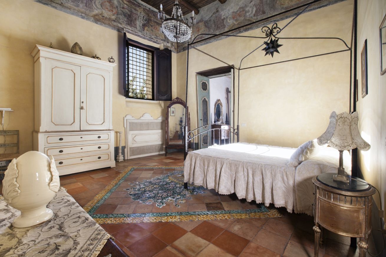 Immerse yourself in a unique, timeless atmosphere, enhanced by the original late Baroque frescoes found in the rooms, as well as by the countless artistic details that perfectly reflect the late-18th-century Mediterranean style of a typical noble residence. The home is located on the piano nobile of the eastern wing of the palace and is composed of four spacious rooms: the first two are used as a kitchen and living room, while the remaining two form the sleeping area, with two large bedrooms, one of which has an en-suite bathroom.