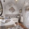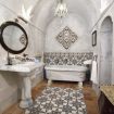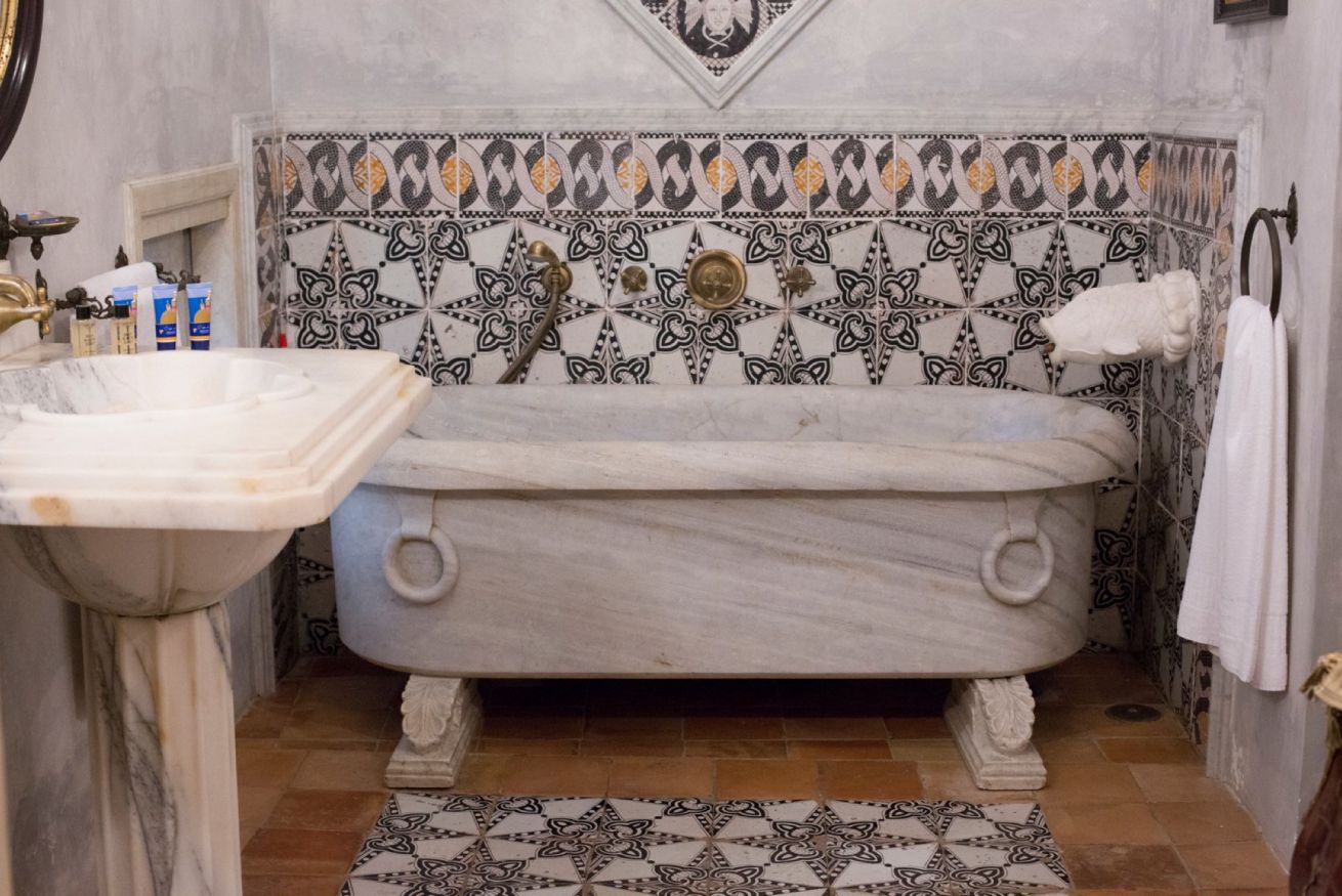 A second bathroom, featuring a white Carrara marble bathtub, is located to the left of the kitchen.