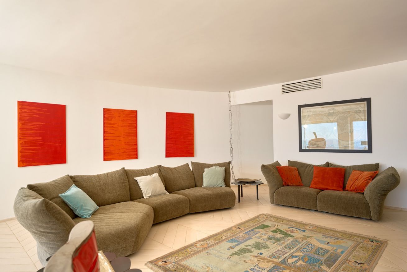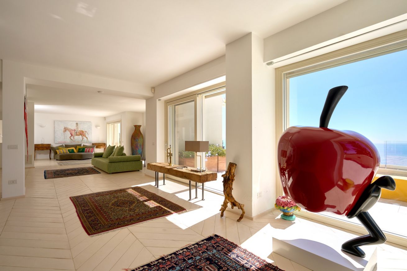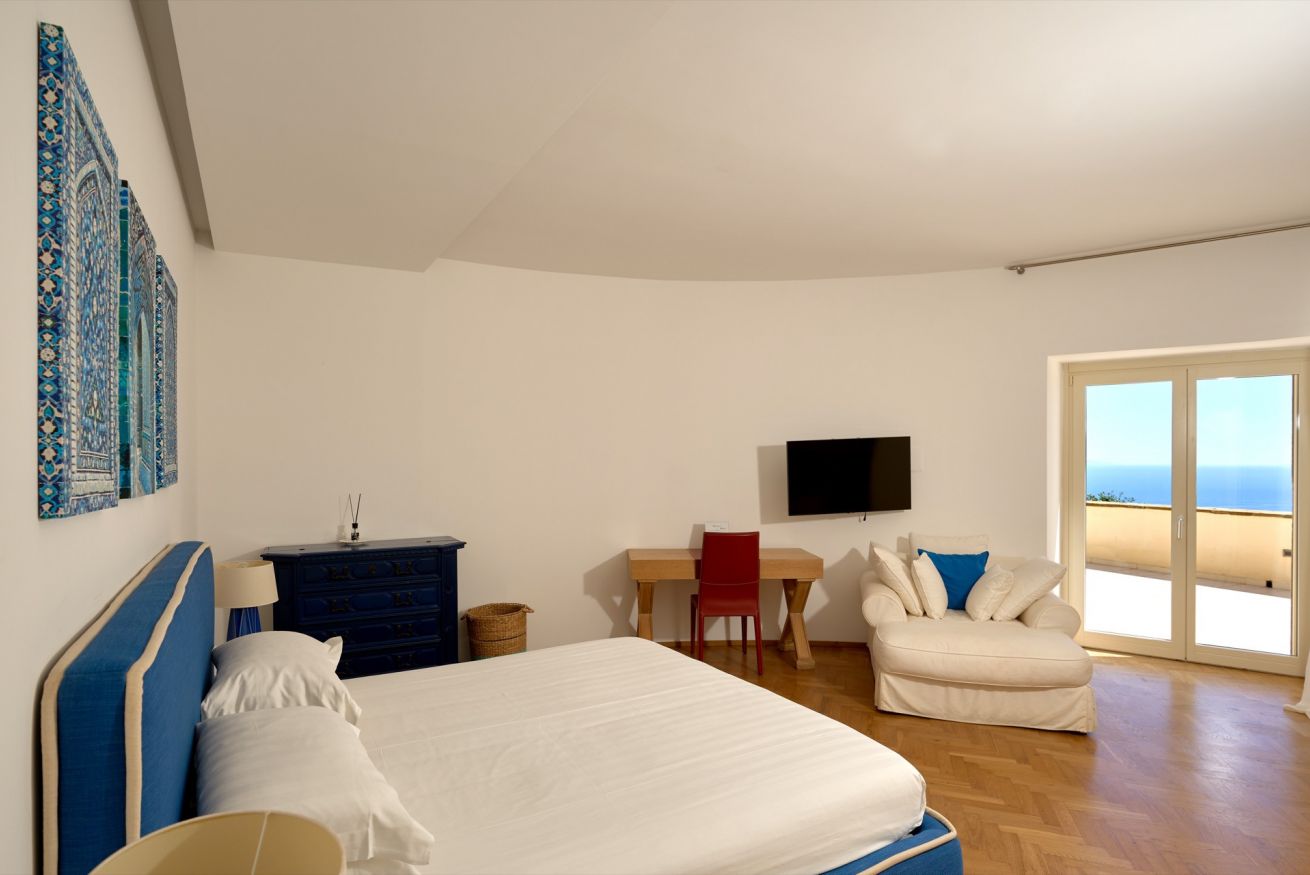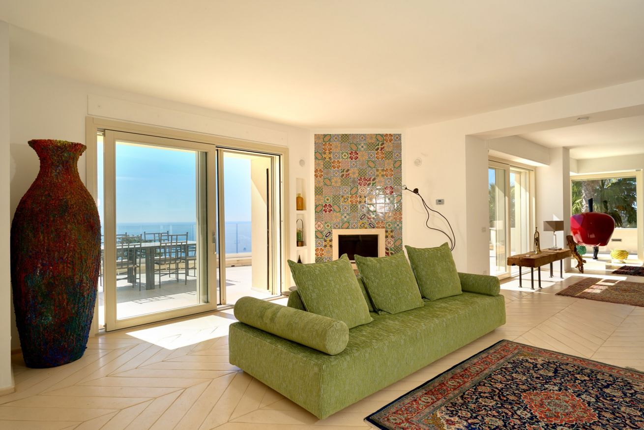 The main living area flows onto a panoramic terrace with lounge seating and hand-painted Vietri tables.