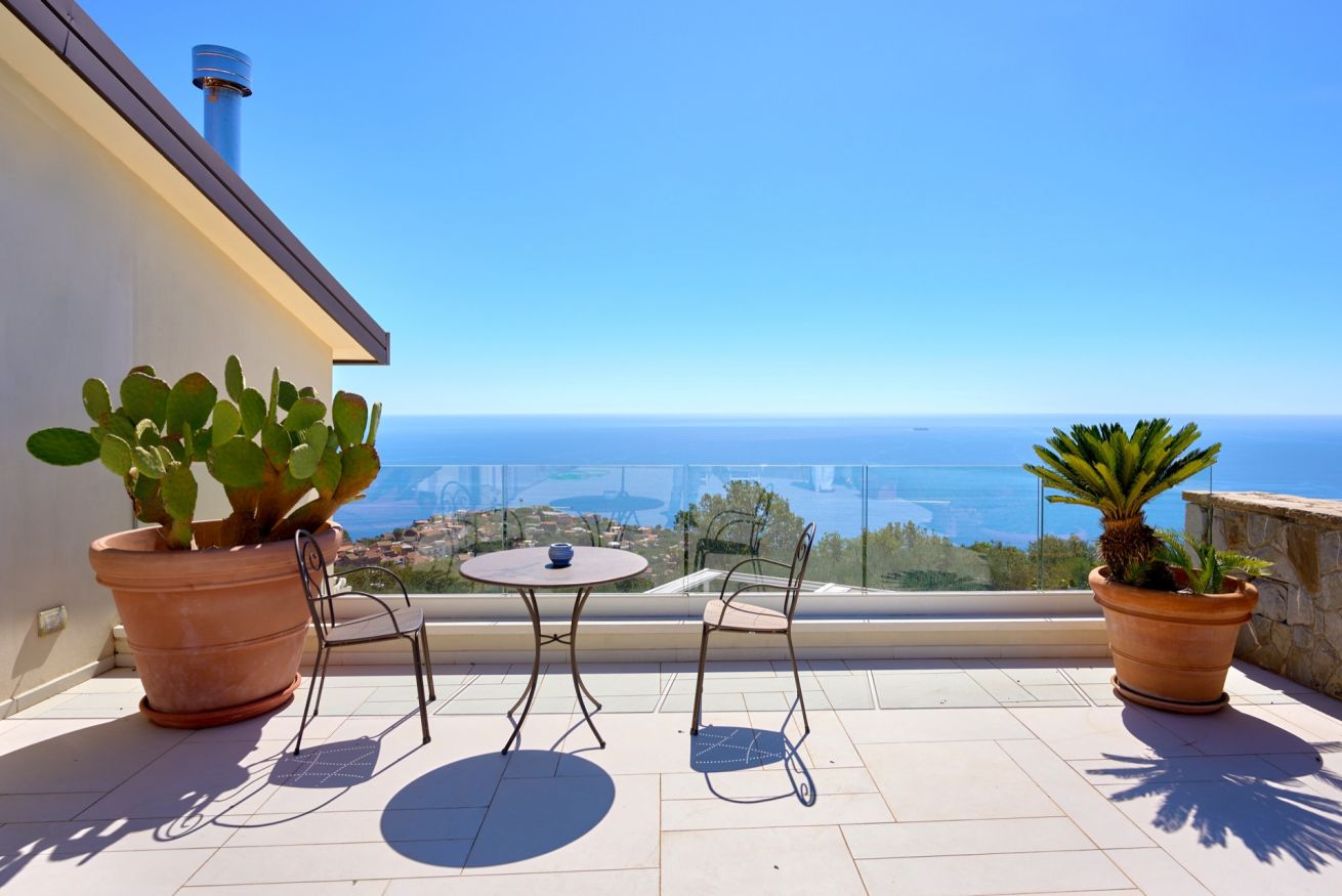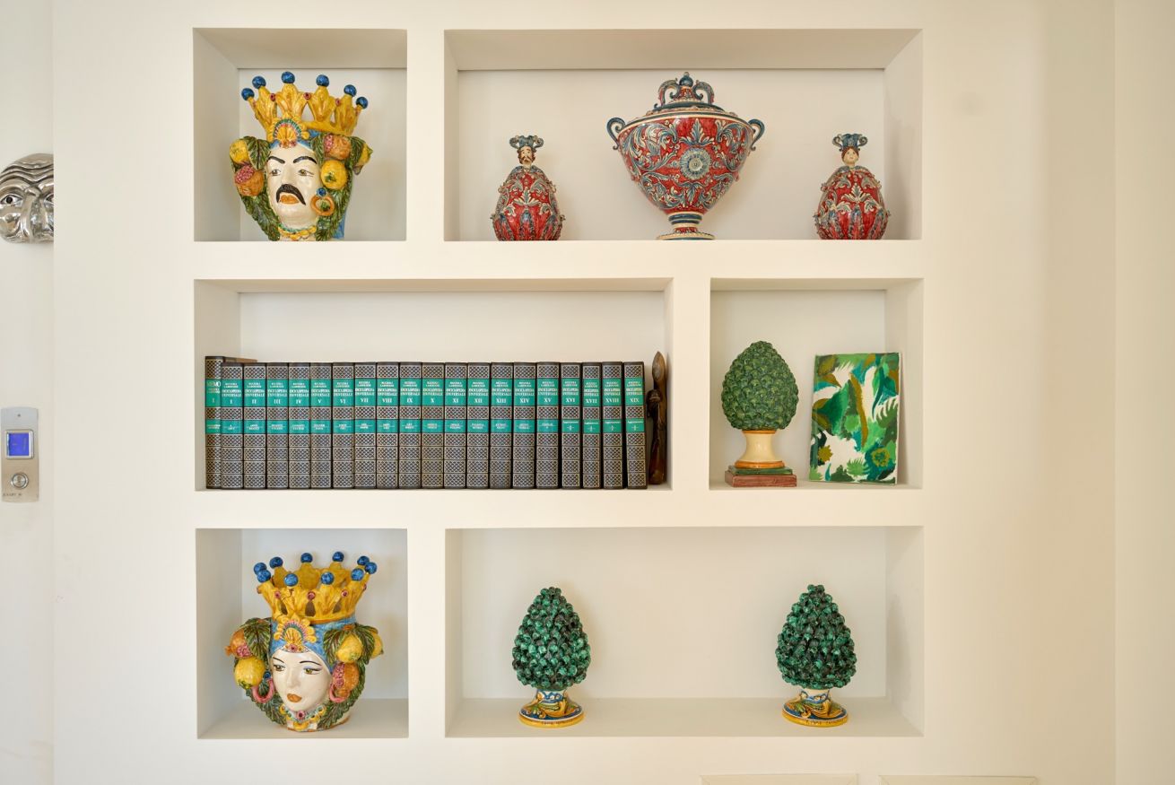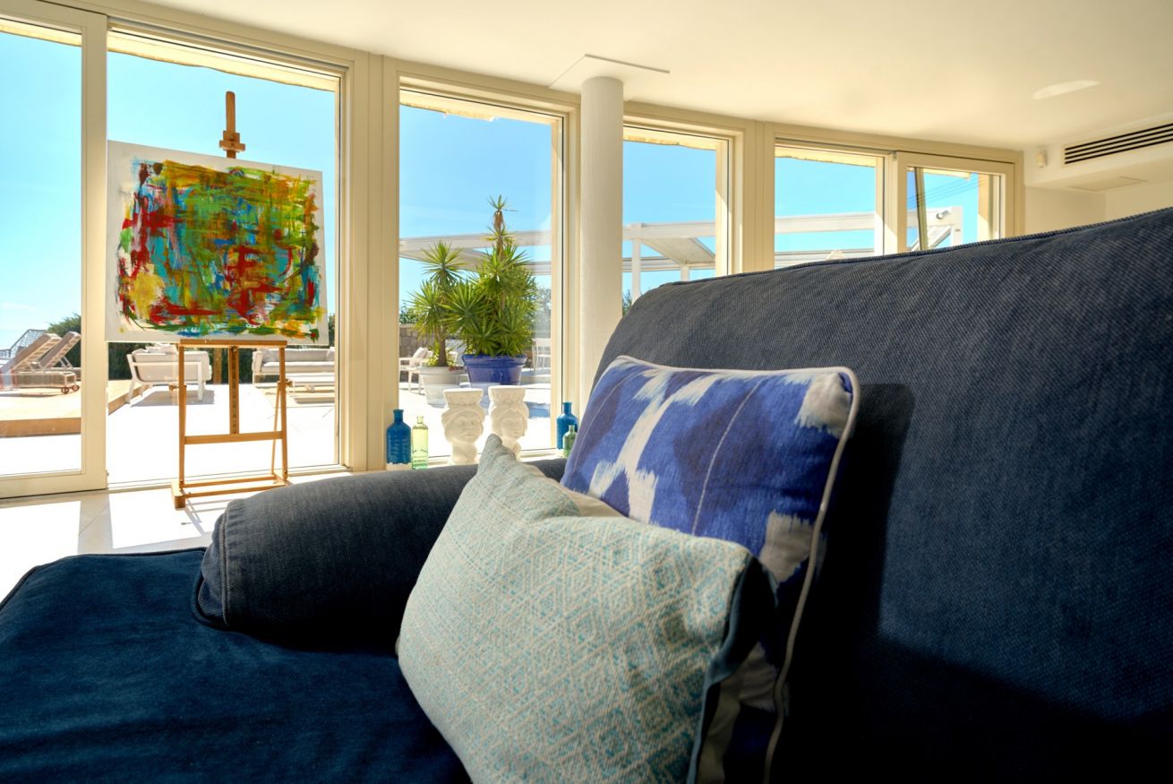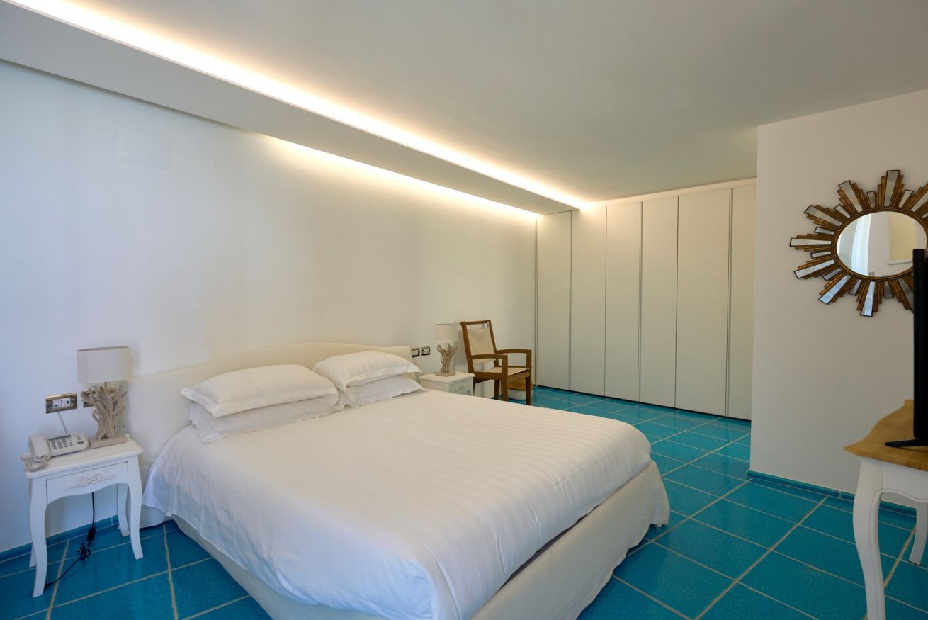 The main living area flows onto a panoramic terrace with lounge seating and hand-painted Vietri tables.