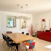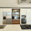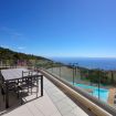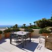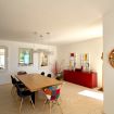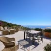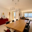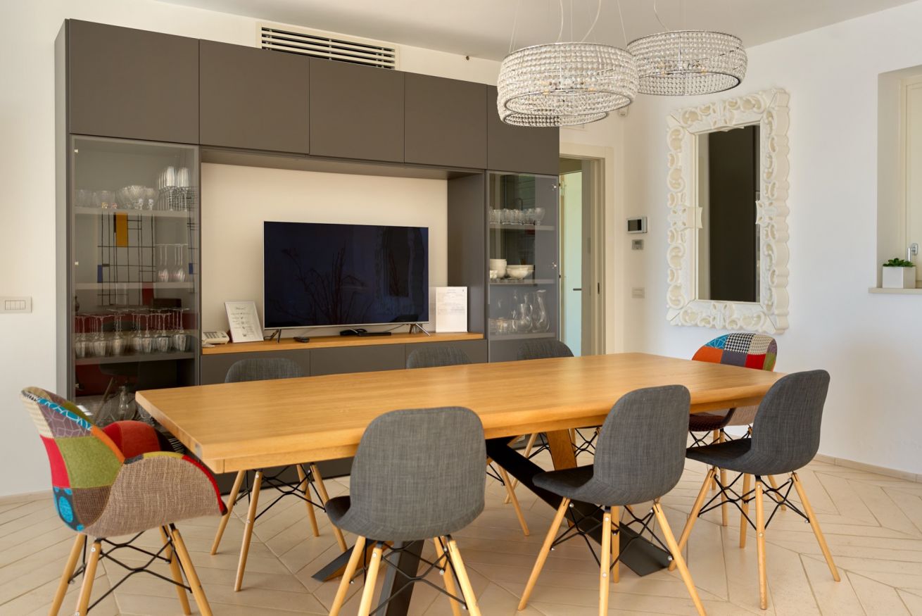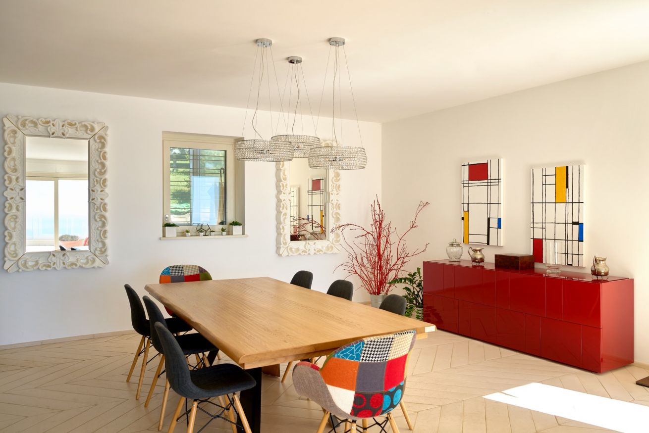 The dining room and professional kitchen feature high-end appliances, perfect for private chef experiences or breakfast overlooking the Mediterranean.