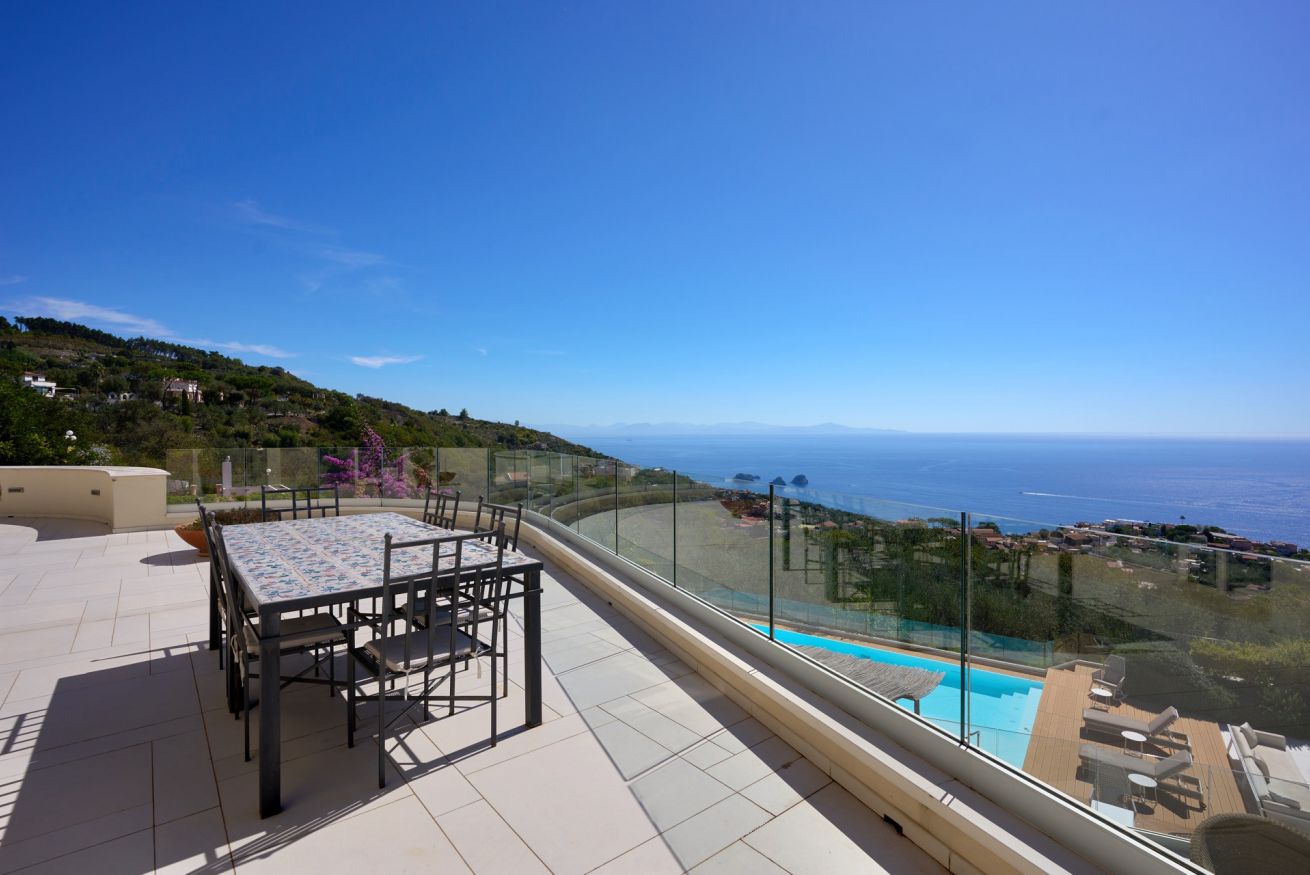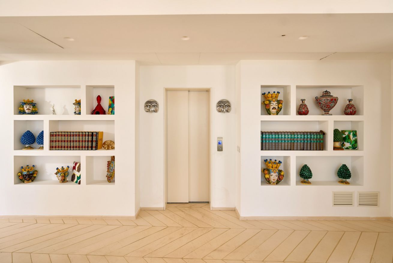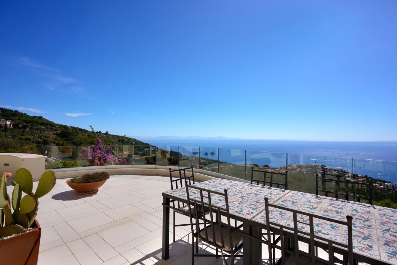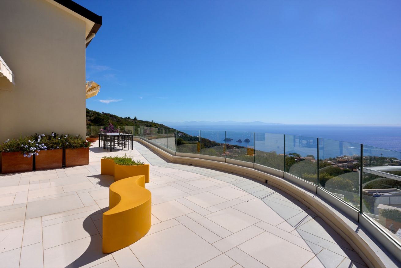The multi-level layout, served by an internal elevator, opens onto terraces overlooking the horizon and the Li Galli Islands.