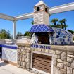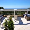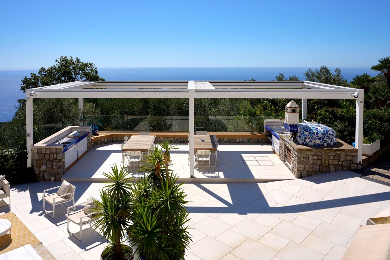 An elegant bioclimatic pergola shelters the outdoor dining space, complemented by a fully equipped summer kitchen with ceramic-tiled wood oven, stone barbecue, and bar counter — ideal for alfresco dining under the stars.