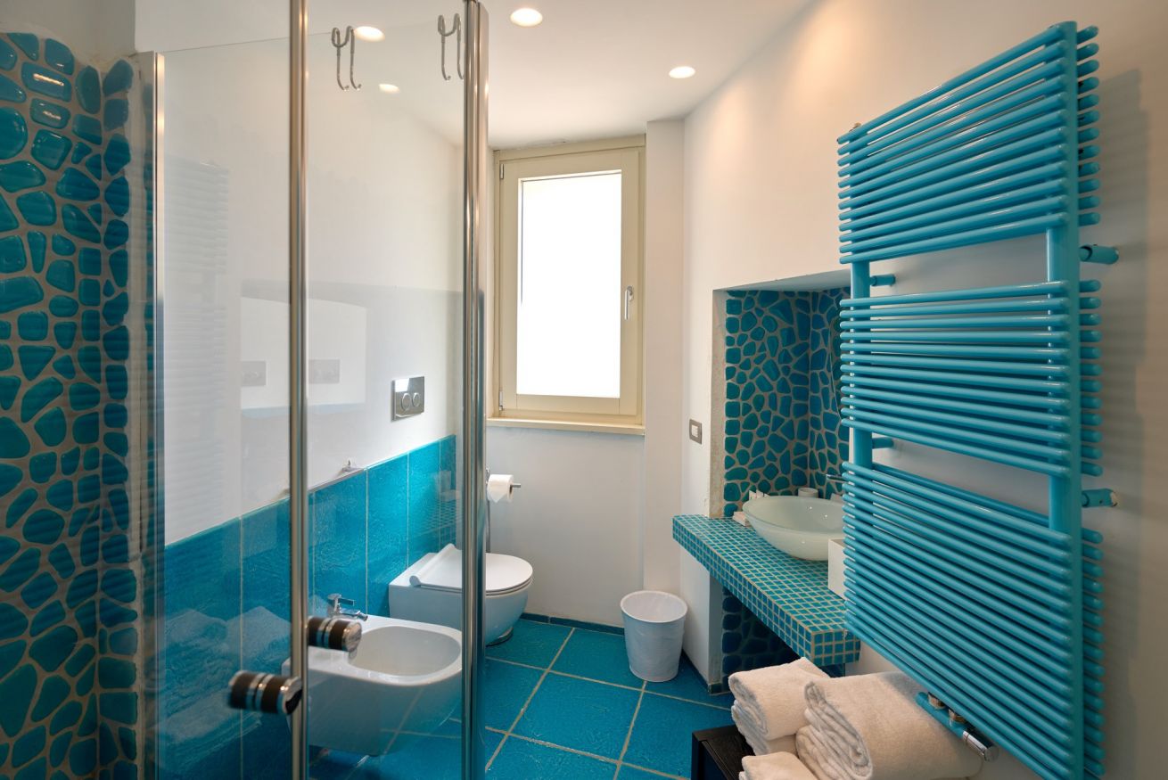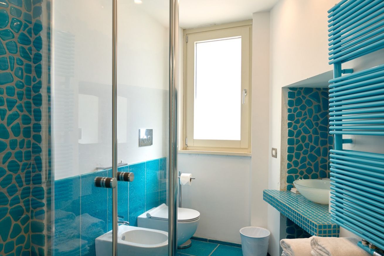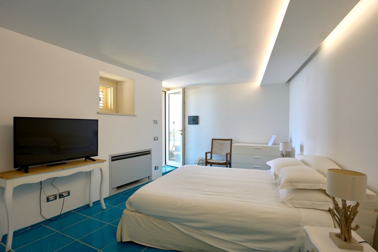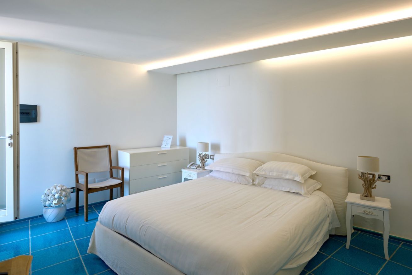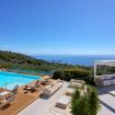 The master suites enjoy panoramic terraces and open bathrooms with sea views toward Li Galli.