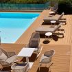 The infinity pool appears to float above the sea, framed by a teak solarium with loungers and shaded relaxation areas.