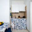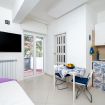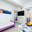 The accommodation is arranged as a single, bright, and functional space, with no separation between the sleeping and living areas—perfect for couples or travelers seeking practicality and comfort. Tastefully furnished, it includes a relaxation area, a fully equipped kitchenette, a dining space, and direct access to a furnished balcony, ideal for enjoying breakfast outdoors or a moment of relaxation.