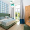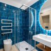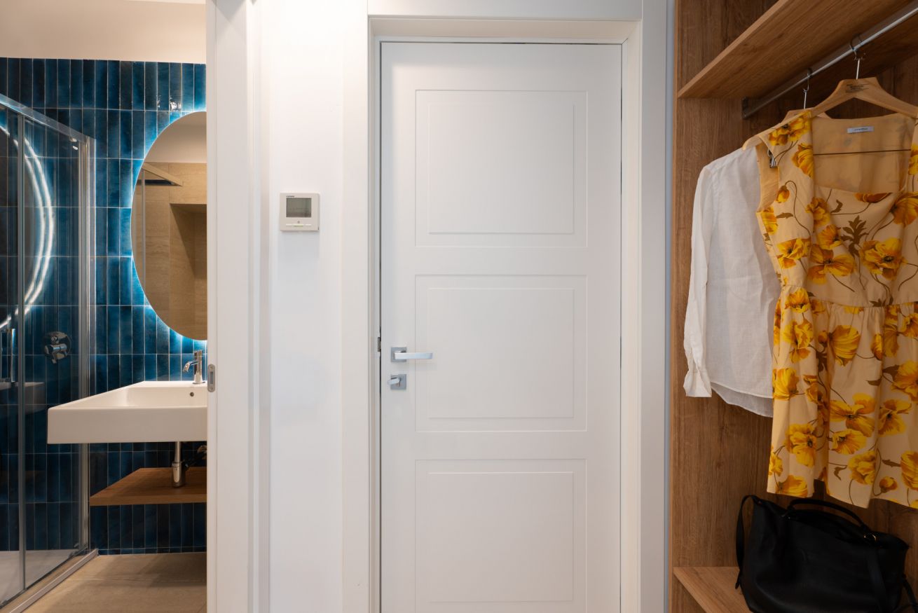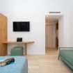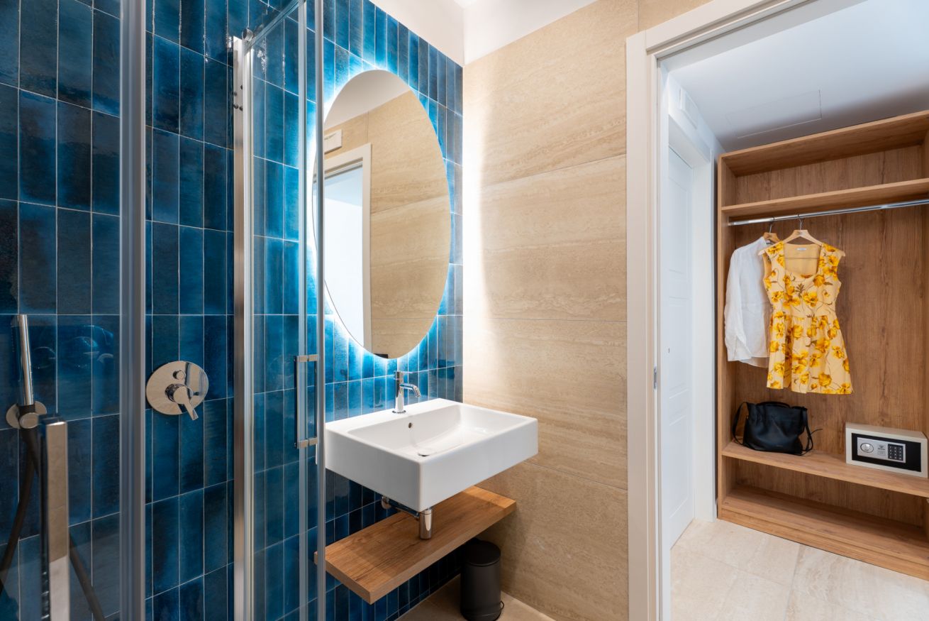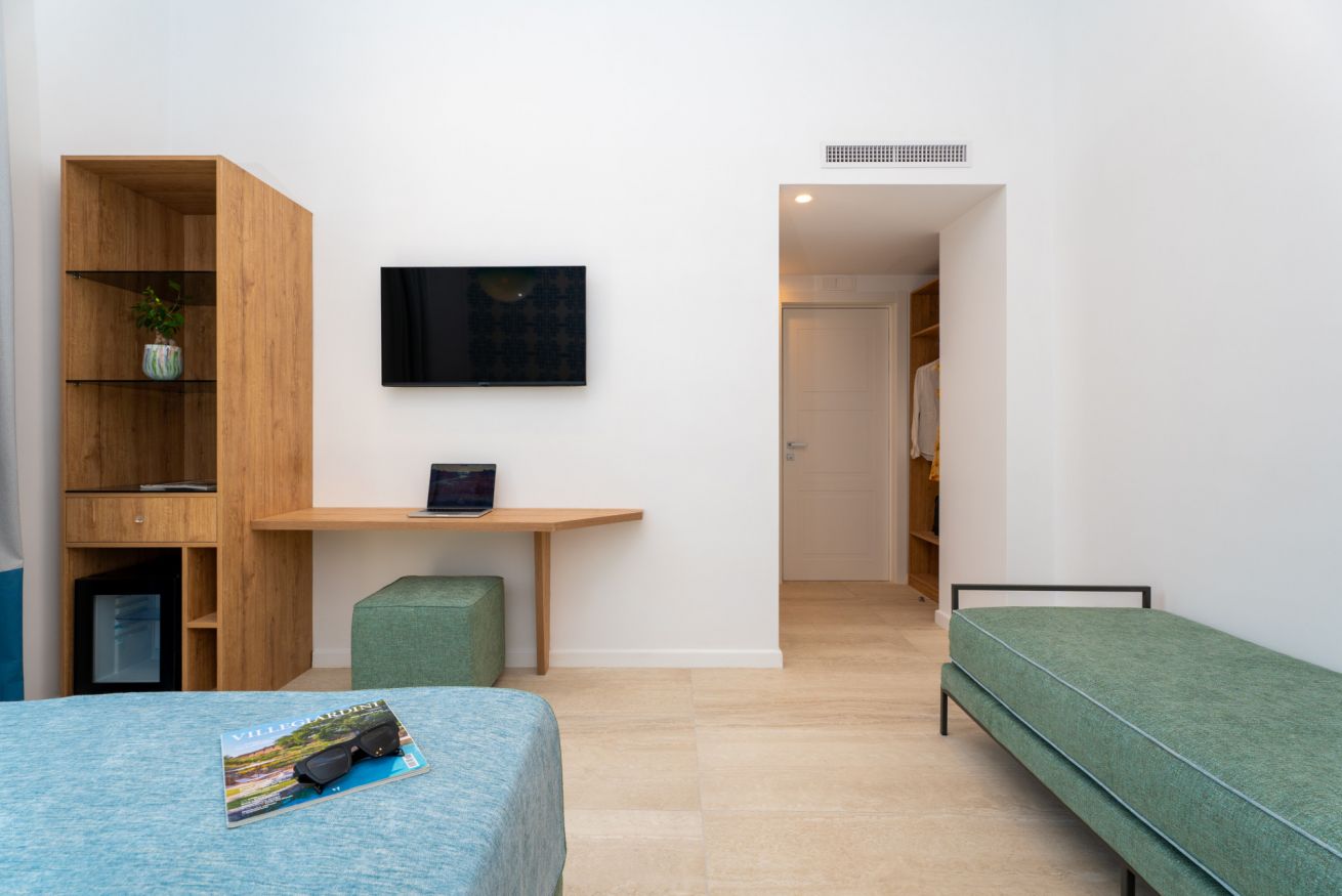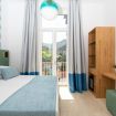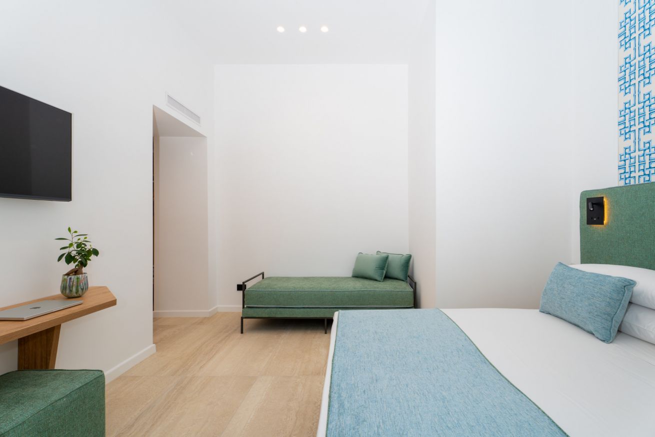 Spacious and bright room, furnished in a modern style with blue accents and natural wood details. It features a queen-size bed and an additional single bed, with the option of 3 single beds, making it ideal for families or small groups. A flat-screen TV, desk, Wi-Fi, and air conditioning ensure every comfort. Private bathroom with large shower, hairdryer, and complimentary toiletries. Perfect for a practical and relaxing stay in the city.