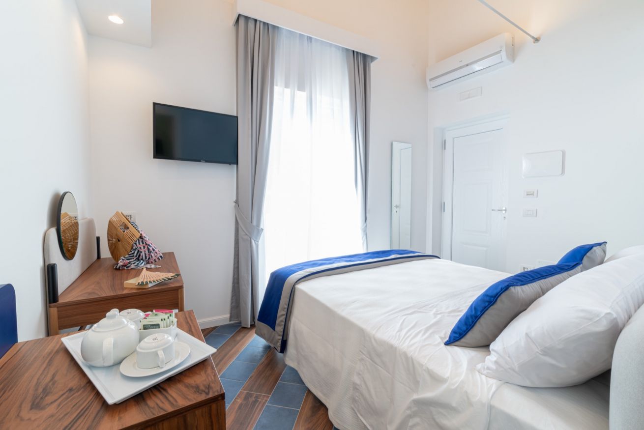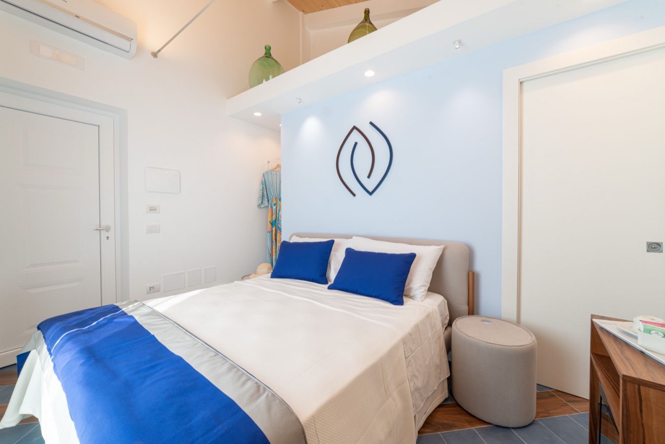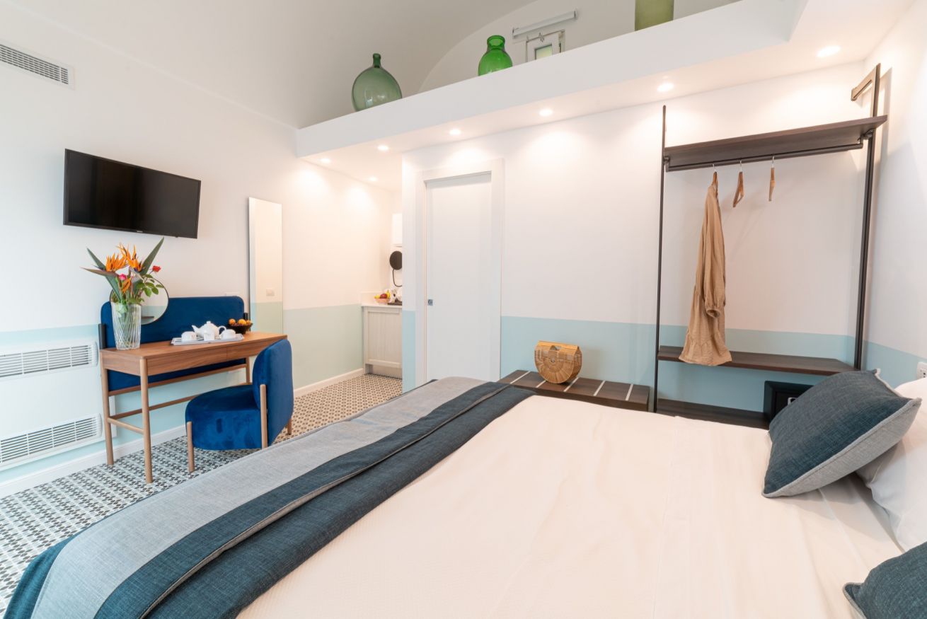 This is the ideal location for a couple’s holiday: the room is located on the second floor of our elegant building recently renovated and designed to ensure comfort and privacy for our guests. The colours used to decorate the room are inspired by the blue waters that line the famous Faraglioni.